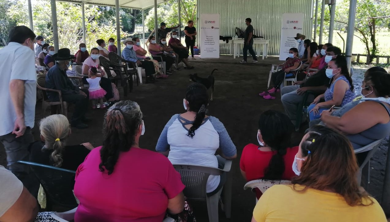 Habitantes del caserío Los Ranchos reunidos para conocer del proceso de entrega de dinero en efectivo.