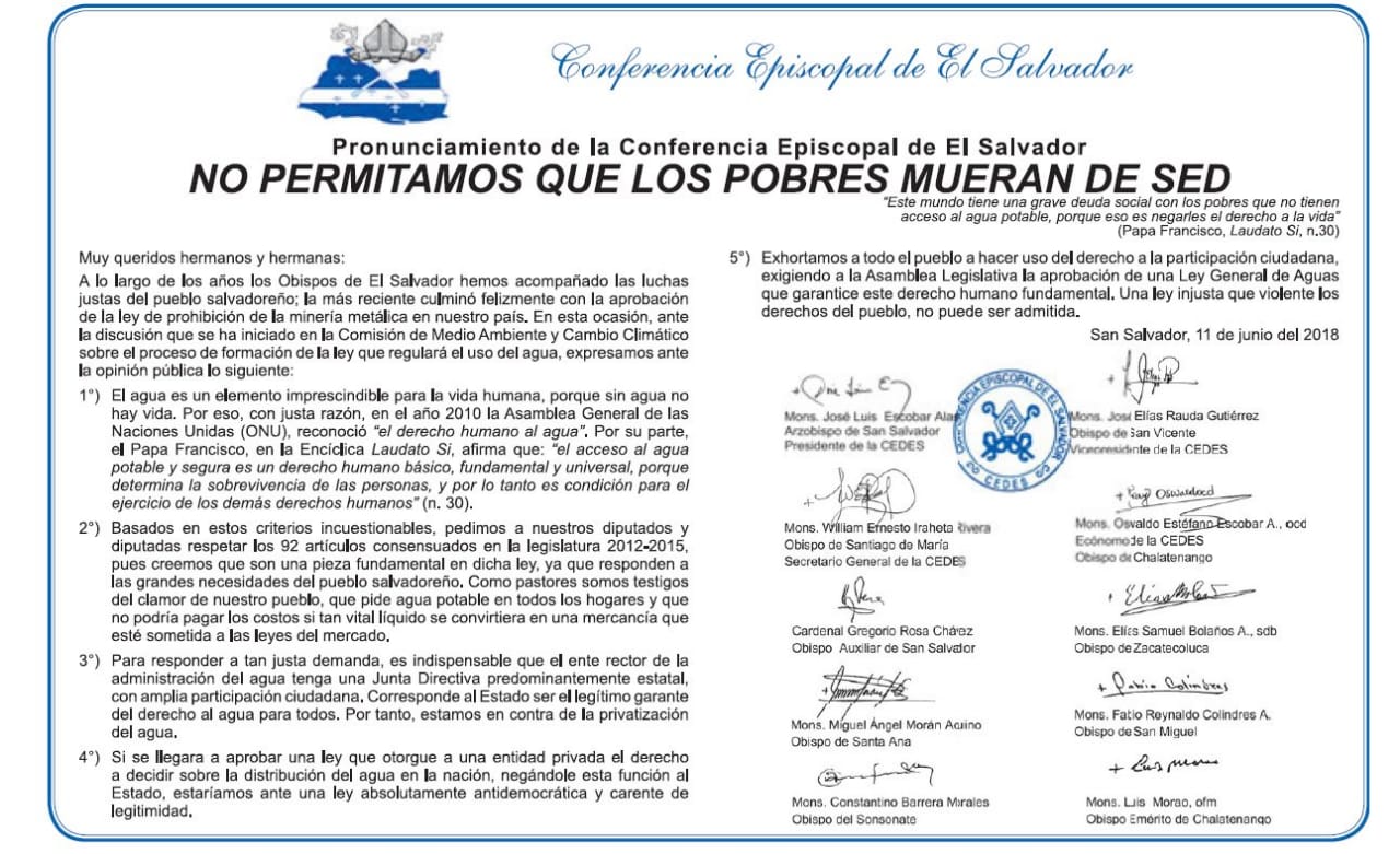 La Conferencia Episcopal de El Salvador hace un llamado a los diputados a no aprobar una ley que privatice el don del agua. Esa sería una ley antidemocratica dijo el presidente de la Conferencia de Obispos Monseñor José Luis Escobar. A continuación el comunicado completo.