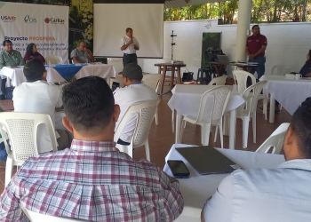 Carlos Avendaño, (agricultor promotor miembro de la REPASAIL) y Valentina López, técnica del equipo de la Pastoral de Agricultura Sostenible (PAS) y de la Pastoral Campesina y de la Tierra (PCyT) de Cáritas Diócesis de San Vicente. Facilitaron reunión comunitaria sobre generalidades de agricultura sostenible e intercambio de semillas criollas, con agricultore(a)s de la comunidad El Embarcadero, Jutiapa. Pobladores originarios del municipio de San José Cancasque, Chalatenango.